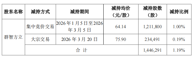 近日,公司收到股东群智方立出具的《关于减持计划届满的告知函》,截至公告日,股东群智方立本次减持计划已届满。2026年1月5日至2026年3月5日,群智方立通过集中竞价交易方式减持1,211,800股股份,减持均价64.14元/股;2026年3月20日,群智方立通过大宗交易方式减持234,491股股份,减持均价75.90元/股。