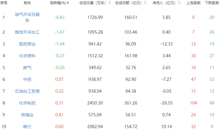 板块方面,贵金属、元件、IT服务等涨幅居前,油气开采及服务、煤炭开采加工、医药商业等跌幅居前。