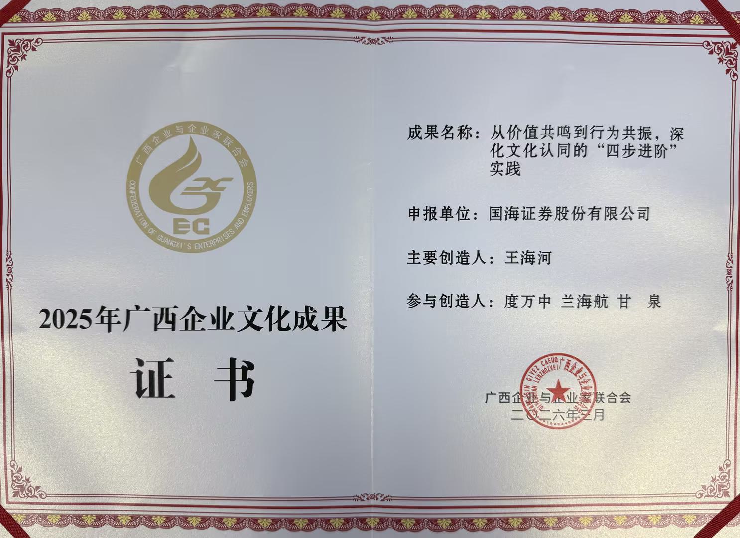 2025年广西企业文化优秀成果评选结果正式揭晓,国海证券首次参评即获得成功斩获此项荣誉。公司以“价值认知—行为塑造—情感联结—价值共创”四步进阶实践案例的成功获奖,,深化文化认同,树立了广西企业文化建设标杆。此次获评,是对公司长期深耕文化建设、以文化赋能高质量发展、切实履行金融国企责任担当的充分肯定。