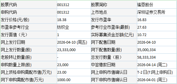 福恩股份4月9日披露的首次公开发行股票并在主板上市发行公告显示,公司本次募投项目预计使用募集资金为125,000.00万元。按本次发行价格18.38元/股计算,公司预计募集资金107,216.67万元,扣除发行费用8,953.10万元(不含增值税)后,预计募集资金净额为98,263.57万元(如存在尾数差异,为四舍五入造成)。