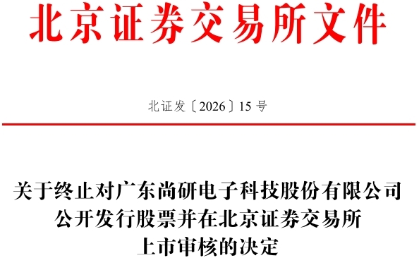 日前,尚研科技向北交所提交了《广东尚研电子科技股份有限公司关于撤回向不特定合格投资者公开发行股票并在北京证券交易所上市申请材料的申请》。根据《北京证券交易所向不特定合格投资者公开发行股票并上市审核规则》第五十五条的有关规定,北交所决定终止尚研科技疗公开发行股票并在北京证券交易所上市的审核。