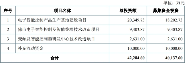 尚研科技原拟募集资金40,137.60万元,分别用于电子智能控制产品生产基地建设项目、佛山电子智能控制及智能终端技术改造项目、变频及智能控制器研发中心技术改造项目、补充流动资金。