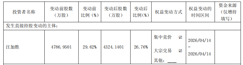 中国经济网北京4月15日讯 鹿山新材(603051.SH)昨晚披露关于控股股东、实际控制人及其一致行动人权益变动触及1%刻度的提示性公告称,公司于2026年4月14日收到汪加胜《关于股份减持进展情况的告知函》,汪加胜于2026年4月14日,通过大宗交易方式减持公司股份3,230,000股,占公司总股本的2%,通过集中竞价方式减持公司股份1,398,100股,占公司总股本的0.86%。减持后汪加胜持股比例由29.62%下降至26.76%,控股股东、实际控制人及其一致行动人合计持股比例由36.48%下降至33.62%,权益变动触及1%刻度。