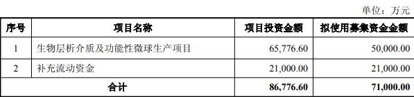 本次向特定对象发行A股股票募集资金总额不超过71,000.00万元(含本数),扣除相关发行费用后拟用于投资生物层析介质及功能性微球生产项目、补充流动资金。