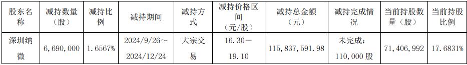 2025年12月19日,公司收到股东陈荣华及深圳纳微发来的告知函,陈荣华通过深圳纳微以集中竞价及大宗交易方式累计减持公司股份3,532,643股,占公司总股本比例为0.8748%。截至公告披露日,本次减持计划已实施完毕。本次减持套现89,770,641.61元。
