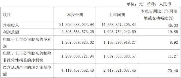 中国经济网北京4月16日讯 正泰电器(601877.SH)昨晚披露的2026年第一季度报告显示,公司首季实现营业收入213.03亿元,同比增长46.33%;归属于上市公司股东的净利润12.67亿元,同比增长8.92%;归属于上市公司股东的扣除非经常性损益的净利润12.10亿元,同比增长11.27%;经营活动产生的现金流量净额41.19亿元,同比增长70.40%。