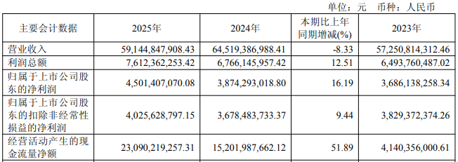 正泰电器昨晚披露的2025年年度报告显示,公司去年实现营业收入591.45亿元,同比下降8.33%;归属于上市公司股东的净利润45.01亿元,同比增长16.19%;归属于上市公司股东的扣除非经常性损益的净利润40.26亿元,同比增长9.44%;经营活动产生的现金流量净额230.90亿元,同比增长51.89%。