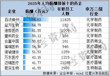 红星资本局根据企业年报、wind数据统计发现,药明康德创始人李革以3998万元的年薪暂列药企管理层第一,较第二名高出1800多万元,其连续位列A股管理层薪酬榜首。人均薪酬方面,百济神州达到94.63万元,位居第一。2025年,该公司研发人员的数量达到4281人,平均薪酬为102.1万元。