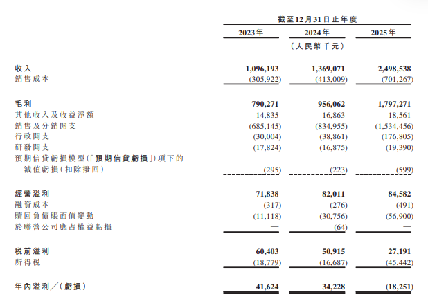 小阔科技招股书显示,2023年至2025年,公司收入分别为10.96亿元、13.69亿元、24.99亿元,毛利分别为7.90亿元、9.56亿元、17.97亿元,年内溢利分别为4162.4万元、3422.8万元、-1825.1万元。