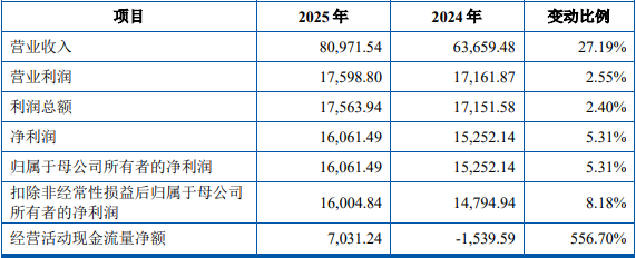 2025年全年,公司营业收入为80,971.54万元,较上年同期增长27.19%;净利润16,061.49万元,较上年同期增长5.31%;扣除非经常性损益后归属于母公司股东的净利润为16,004.84万元,较上年同期增长8.18%;经营活动现金流量净额7,031.24万元。