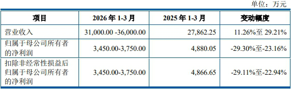 公司预计2026年1-3月实现营业收入31,000.00万元至36,000.00万元,同比变动11.26%至29.21%;预计实现归属于母公司股东的净利润3,450.00万元至3,750.00万元,同比变动-29.30%至-23.16%;预计实现扣除非经常性损益后归属于母公司股东的净利润3,450.00万元至3,750.00万元,同比变动-29.11%至-22.94%。