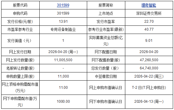 理奇智能2026年4月17日披露的首次公开发行股票并在创业板上市发行公告显示,按本次发行价格13.91元/股计算,公司募集资金总额预计为90,053.34万元,扣除预计发行费用8,142.70万元(不含增值税)后,预计募集资金净额约为81,910.64万元。
