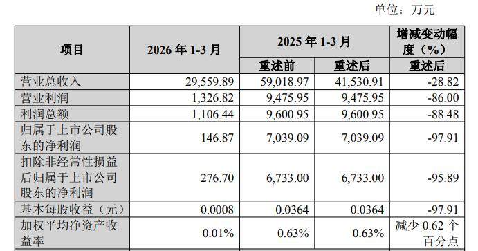 国盛证券昨晚发布2026年第一季度业绩快报显示,报告期内,公司实现营业总收入29,559.89万元,同比下降28.82%;利润总额1106.44万元,同比下降88.48%;归属于上市公司股东的净利润146.87万元,同比下降97.91%;扣除非经常性损益后归属于上市公司股东的净利润276.70万元,同比下降95.89%。