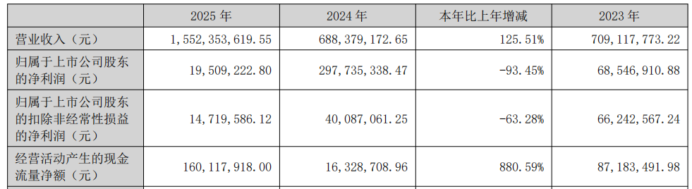 中国经济网北京4月22日讯 江天化学(300927.SZ)日前披露2025年年报显示,报告期内,公司营业收入为15.52亿元,同比增长125.51%;归属于上市公司股东的净利润为1950.92万元,同比下降93.45%;归属于上市公司股东的扣除非经常性损益的净利润为1471.96万元,同比下降63.28%;经营活动产生的现金 流量净额为1.60亿元,同比增长880.59%。