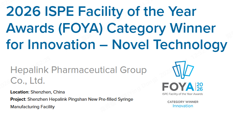4月20日,国际制药工程协会(ISPE)公布了2026年度设施奖(FOYA,Facility of the Year Awards),来自全球医药企业的10个医药设施获奖。作为被誉为“医药设施奥斯卡”的国际权威奖项,FOYA代表着全球制药工程与医药制造领域的高水平专业认可。海普瑞药业坪山新建预灌封制剂智造项目凭借在高黏度制剂产品制造领域的突破性创新,斩获“创新-新技术”类别大奖,是本届获奖的唯一中国企业,也是FOYA设立的20多年中,中国药企在境内建设的医药制造设施中唯一获此殊荣的项目。赛诺菲、拜耳等国际顶尖医药企业亦位列本届榜单。