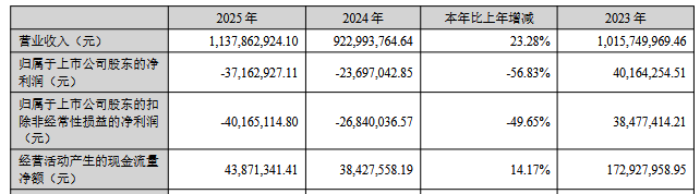 2025年,公司实现营业收入11.38亿元,同比增长23.28%;归属于上市公司股东的净利润为-3,716.29万元,上年同期为-2,369.70万元;归属于上市公司股东的扣除非经常性损益的净利润为-4,016.51万元,上年同期为-2,684.00万元;经营活动产生的现金流量净额为4,387.13万元,同比增长14.17%。