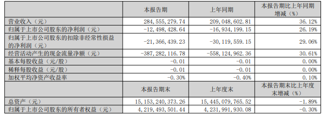 蒙草生态2026年一季度报告显示,公司报告期内营业总收入为2.85亿元,同比增长36.12%;归属于上市公司股东的净利润为-1249.84万元,去年同期为-1693.42万元;归属于上市公司股东的扣除非经常性损益的净利润为-2136.64万元,去年同期为-3011.96万元;经营活动产生的现金流量净额为-3.87亿元。