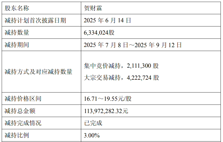 此前于2025年7月8日至2025年9月12日,公司实际控制人贺财霖通过集中竞价和大宗交易方式减持公司股份6,334,024股,占公司总股本的3.00%,减持总金额1.14亿元。