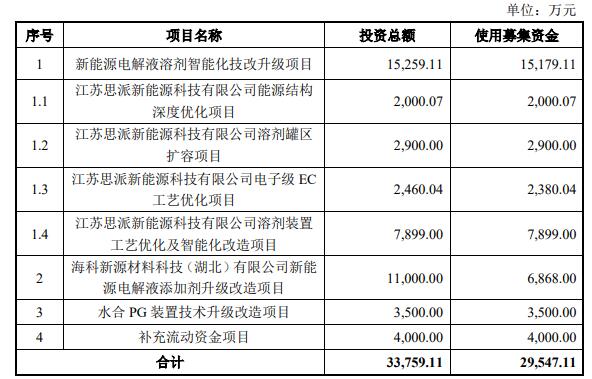 海科新源首次公开发行股票募集资金总额为111,425.85万元,扣除发行费用后募集资金净额为100,434.74万元。海科新源最终募集资金净额比原计划少50,765.26万元。海科新源于2023年7月3日披露的招股说明书显示,该公司拟募集资金151,200.00万元,用于锂电池电解液溶剂及配套项目(二期)。