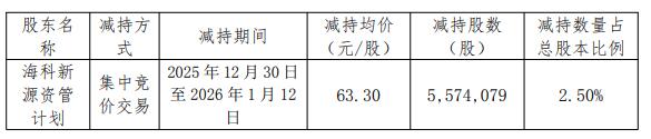 海科新源1月13日发布关于员工战略配售资管计划减持股份计划实施完成的公告。公司于近日收到股东国金证券-招商银行-国金证券海科新源员工参与创业板战略配售集合资产管理计划(简称“海科新源资管计划”或“战略配售资管计划”)出具的《关于减持计划实施完成的告知函》。海科新源资管计划于2025年12月30日至2026年1月12日完成减持股数5,574,079股,减持均价63.30元/股。经计算,海科新源资管计划套现金额为3.53亿元。