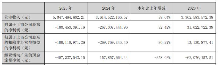 海科新源连亏两年。2024年、2025年,海科新源归属于上市公司股东的净利润分别为-2.67亿元,-1.8亿元;归属于上市公司股东的扣除非经常性损益的净利润分别为-2.70亿元、-1.88亿元;经营活动产生的现金流量净额分别为1.58亿元、-4.07亿元。