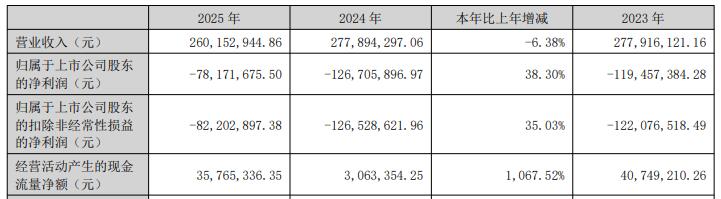 中国经济网北京4月23日讯 铜牛信息(300895.SZ)昨晚发布的2025年年度报告显示,2025年,公司实现营业收入2.6亿元,同比下降6.38%;归属于上市公司股东的净利润-7817.17万元,上年同期-1.27亿元;归属于上市公司股东的扣除非经常性损益的净利润-8220.29万元,上年同期-1.27亿元;经营活动产生的现金流量净额为3576.53万元,同比增长1067.52%。