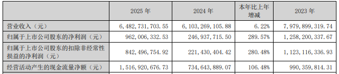 乐普医疗2025年年度报告显示,公司去年实现营业收入64.83亿元,同比增长6.22%;归属于上市公司股东的净利润9.62亿元,同比增长289.57%;归属于上市公司股东的扣除非经常性损益的净利润8.42亿元,同比增长280.48%;经营活动产生的现金流量净额15.17亿元,同比增长106.48%。