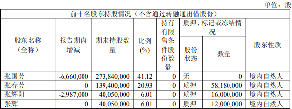 本次减持计划实施前,张国芳持有公司无限售流通股份273,840,000股,限售流通股份0股,合计持有273,840,000股,占公司总股本41.12%。上述股份来源于公司首次公开发行股票前取得的股份。