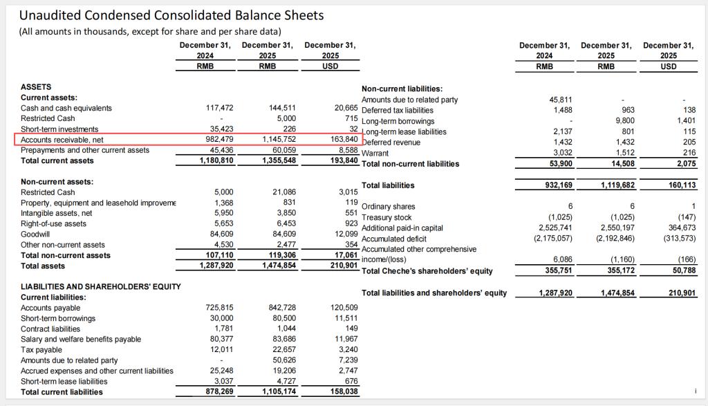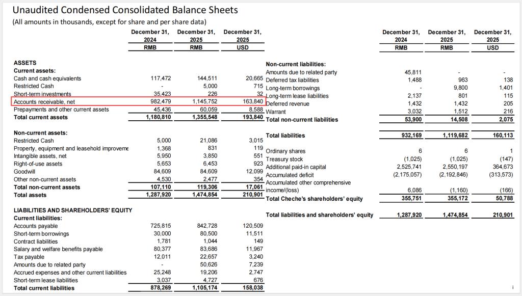 截至2025年末,车车科技应收账款净额11.46亿元,较上年末的9.82亿元增长16.7%。这一数字相当于全年净收入的38%,而在2024年,这一比例约为28%。一年之间,应收款与收入的比例恶化了10个百分点。