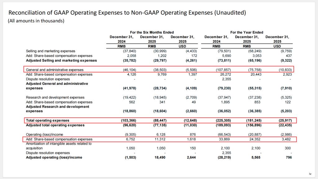 2025年全年,车车科技总运营费用从2.25亿元降至1.81亿元,降幅19.6%。其中,股权激励费用从3387万元降至2435万元,减少近1000万元;一般行政费用从1.08亿元降至7576万元,降幅近30%。