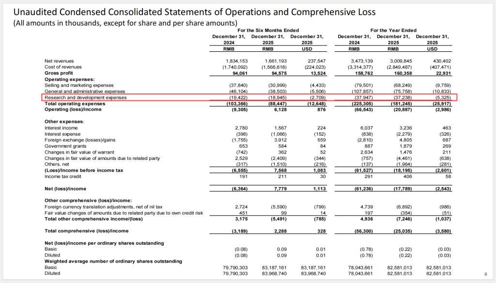 车车科技在财报中强调自己是“专注于AI驱动的保险技术创新(Focused on AI-Driven Insurance Technology Innovation)”。但从费用结构看,最大的节省来自股权激励的减少和行政费用的压缩,而非研发效率的提升——2025年研发费用3724万元,与上年的3795万元基本持平。