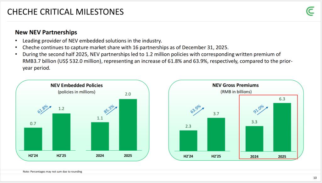 如今,新能源车险的浪潮正在推着车车科技往前走——2025年新能源保费增长91%,与16家车企的合作网络初步建成,首次实现账面盈利。