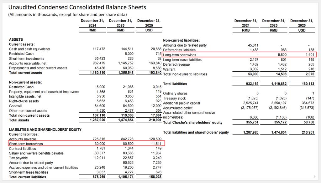 车车科技似乎也意识到了这一问题。2025年末,公司总借款余额(短期借款+长期借款)从上年同期的3000万元增至9030万元,其中短期借款8050万元,长期借款980万元。增幅超过两倍。借款用途在财报中未详细披露,但从现金流状况看,补充营运资金或许是最合理的解释。