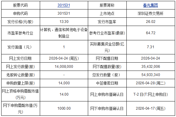 春光集团2026年4月23日披露的首次公开发行股票并在创业板上市发行公告显示,按本次发行价格13.30元/股和5,493.3340万股的新股发行数量计算,若本次发行成功,预计公司募集资金总额为73,061.34万元,扣除8,813.07万元(不含增值税)的发行费用后,预计募集资金净额为64,248.27万元。