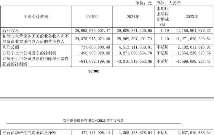 据公司2025年年报,2025年,公司实现营业收入299.94亿元,同比增长1.19%;公司实现归属于母公司所有者的净利润-4.97亿元;实现归属于母公司所有者的扣除非经常性损益的净利润-8.41亿元;经营活动产生的现金流量净额4.72亿元。