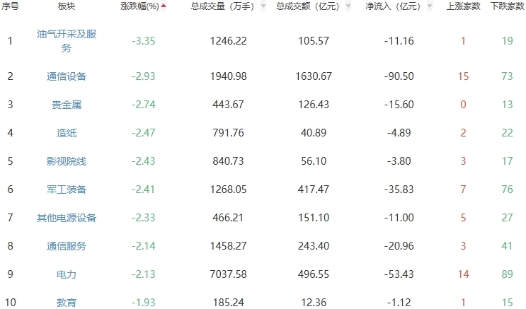 板块方面,能源金属、半导体、农化制品等板块涨幅居前,油气开采及服务、通信设备、贵金属等板块跌幅居前。