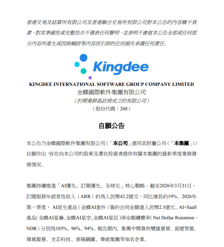 根据金蝶国际的最新业绩,该公司在2026年第一季度实现订阅服务年经常性收入(ARR)约42.2亿元,同比增长19%。集团成功中标双汇发展、面壁智能、绿城服务、全芯科技、普阳钢铁、华统集团等知名企业项目。