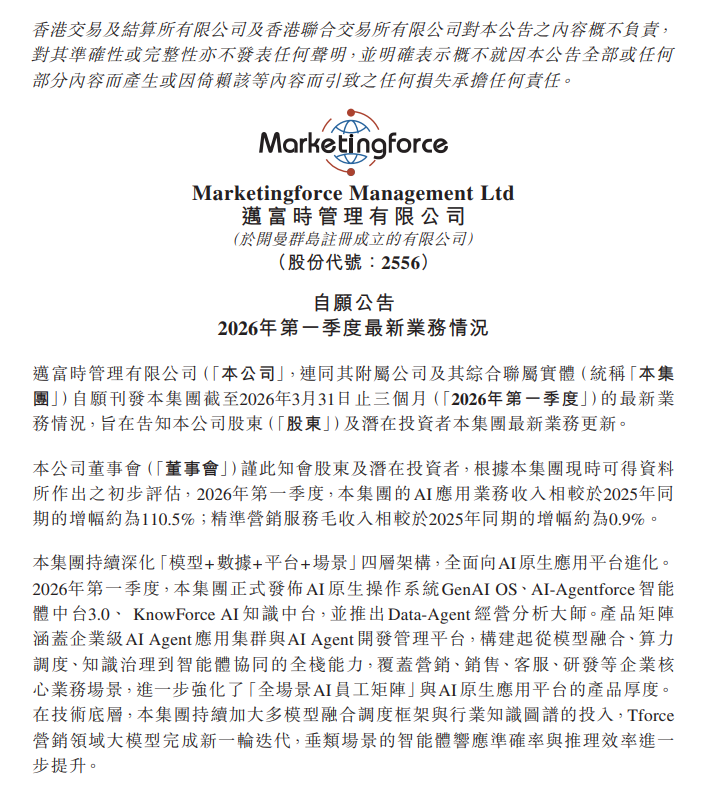 迈富时也在近期发布了2026年第一季度最新业务情况。期内AI应用业务收入同比增长约为110.5%;精准营销服务毛收入同比增长约为0.9%。2025年报显示,公司全年实现营业收入28.18亿元,同比增长80.8%;经调整净利润1.52亿元,同比增长91.3%。