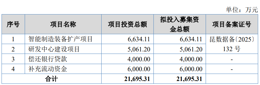 鸿仕达本次募集资金总额为22,369.50万元,扣除不含税的发行费用后募集资金净额为19,420.43万元,比原计划少2,274.88万元。鸿仕达2026年4月9日披露的招股书显示,公司拟募集资金21,695.31万元,用于智能制造装备扩产项目、研发中心建设项目、偿还银行贷款、补充流动资金。