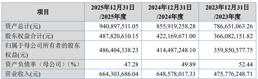 2023年至2025年,鸿仕达的营业收入分别为47,577.62万元、64,857.80万元和66,430.37万元;净利润分别为3,852.87万元、5,348.62万元和7,048.00万元;归属于母公司所有者的净利润分别为3,926.78万元、5,249.58万元和6,975.14万元;归属于母公司所有者的扣除非经常性损益后的净利润分别为3,641.44万元、5,043.86万元和6,208.02万元。