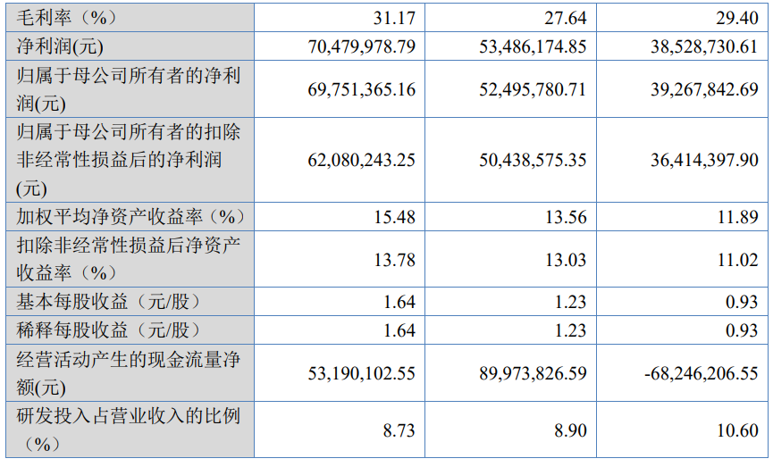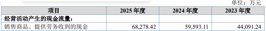 上述同期,公司销售商品、提供劳务收到的现金分别为44,091.24万元、59,593.11万元和68,278.42万元;经营活动产生的现金流量净额分别为-6,824.62万元、8,997.38万元和5,319.01万元。