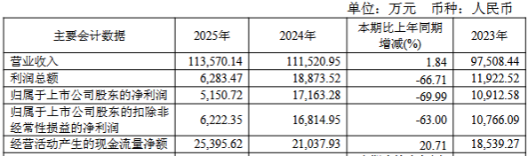 2025年,公司实现营业收入11.36亿元,同比增长1.84%;归属于上市公司股东的净利润为5,150.72万元,同比下降69.99%;归属于上市公司股东的扣除非经常性损益的净利润为6,222.35万元,同比下降63.00%;经营活动产生的现金流量净额为2.54亿元,同比增长20.71%。