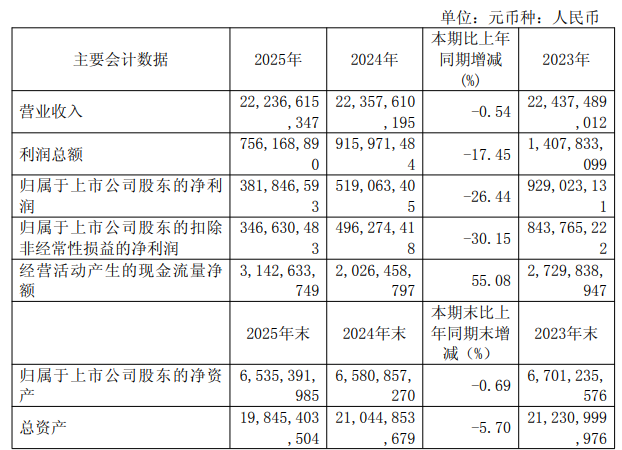 老百姓2025年度报告显示,公司报告期内营业总收入为222.37亿元,同比下滑0.54%;归属于上市公司股东的净利润为3.82亿元,同比下滑26.44%;归属于上市公司股东的扣除非经常性损益的净利润为3.47亿元,同比下滑30.15%;经营活动产生的现金流量净额为31.43亿元。