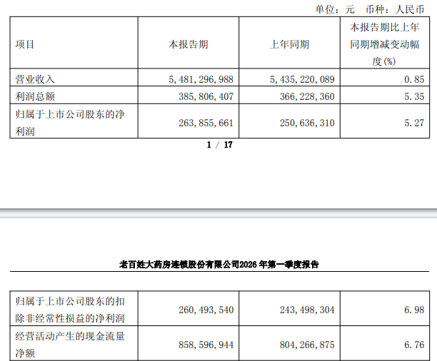 老百姓2026年一季度报告显示,公司报告期内营业总收入为54.81亿元,同比增长0.85%;归属于上市公司股东的净利润为2.64亿元,同比增长5.27%;归属于上市公司股东的扣除非经常性损益的净利润为2.60亿元,同比增长6.98%;经营活动产生的现金流量净额为8.59亿元。