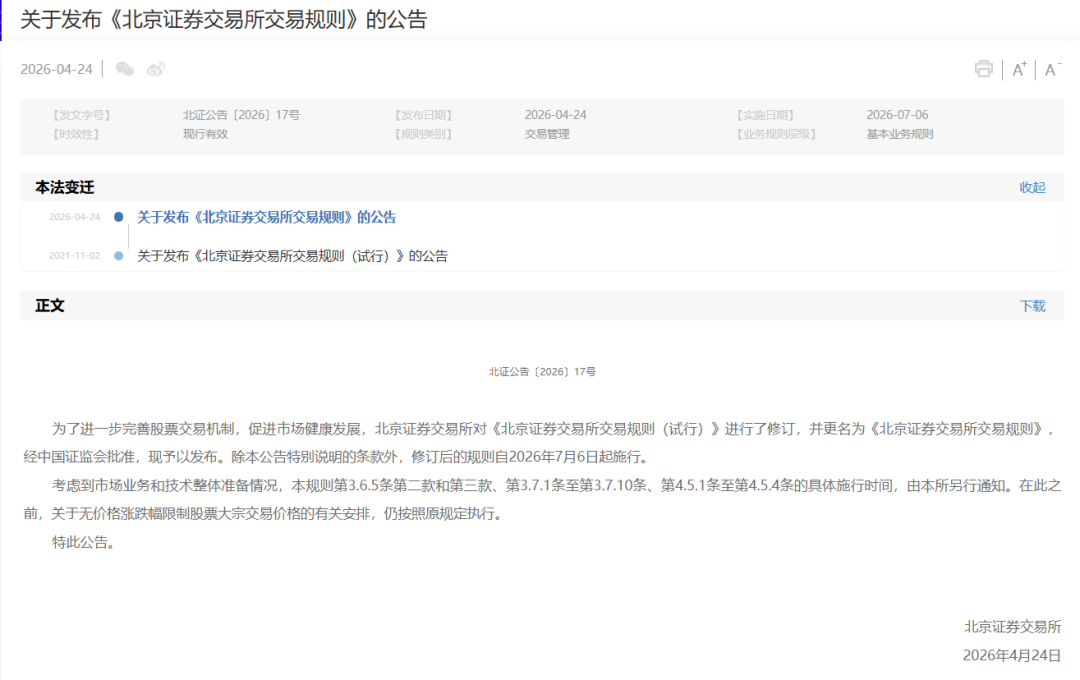 北交所交易规则于2021年11月首次发布并试行。为了进一步完善股票交易机制,促进市场健康发展,北京证券交易所对《北京证券交易所交易规则(试行)》进行了修订,并更名为《北京证券交易所交易规则》,经中国证监会批准,现予以发布。除公告特别说明的条款外,修订后的规则自2026年7月6日起施行。