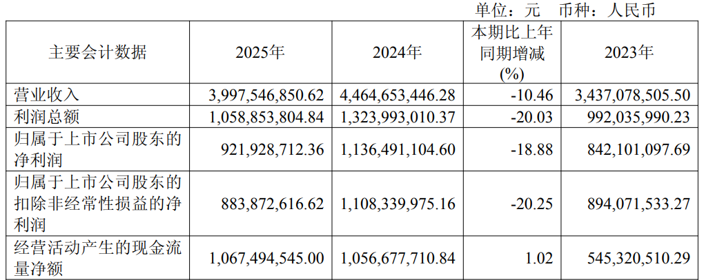 2025年,天有为实现营业收入39.98亿元,同比下降10.46%;归属于上市公司股东的净利润9.22亿元,同比下降18.88%;归属于上市公司股东的扣除非经常性损益的净利润8.84亿元,同比下降20.25%;经营活动现金流量净额为10.67亿元,上年同期为10.57亿元。