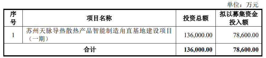 苏州天脉1月12日披露的向不特定对象发行可转换公司债券募集说明书(申报稿)显示,公司本次发行证券的种类为可转换为公司A股股票的可转换公司债券,本次拟发行可转换公司债券募集资金总额不超过人民币78,600.00万元(含本数),具体发行数额提请公司股东会授权公司董事会(或董事会授权人士)在上述额度范围内确定。公司本次扣除发行费用后的募集资金净额拟投资于苏州天脉导热散热产品智能制造甪直基地建设项目(一期)。
