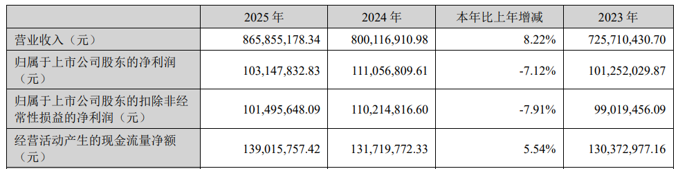 2025年,天溯计量实现营业收入86,585.52万元,同比增长8.22%;实现归属于上市公司股东的净利润10,314.78万元,同比下降7.12%;实现扣除非经常性损益后的净利润10,149.56万元,同比下降7.91%;经营活动产生的现金流量净额为13,901.58万元。