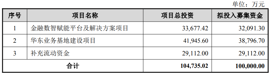 神州信息本次向特定对象发行股票拟募集资金总额不超过100,000.00万元(含本数),扣除相关发行费用后的募集资金净额将全部用于金融数智赋能平台及解决方案项目、华东业务基地建设项目、补充流动资金。