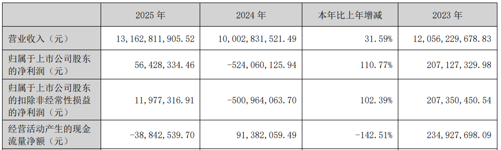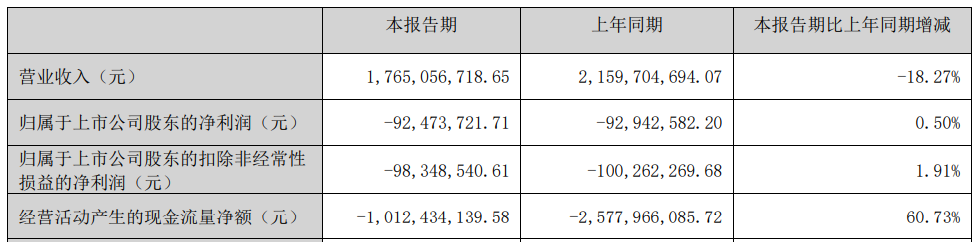 2026年一季度,公司实现营业收入17.65亿元,同比下降18.27%;实现归属于上市公司股东的净利润-9,247.37万元;扣除非经常性损益后的归属于上市公司股东净利润-9,834.85万元;经营活动产生的现金流量净额-10.12亿元。
